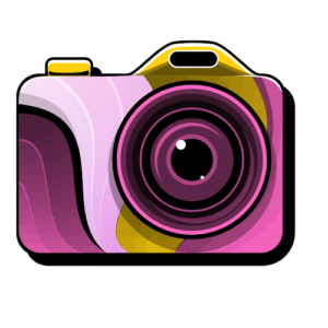 A stylized, colorful camera logo with a retro feel. The camera body features swirling pink, magenta, purple, and gold abstract patterns, centered around a large black and purple lens. The design has thick black outlines.